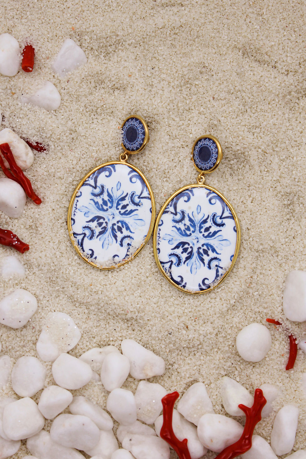 I gioielli sono in ceramica, realizzata secondo gli antichi metodi artigianali, incassati in cornici di argento dorato e impreziositi da pietre naturali come il lapis ed il corallo.